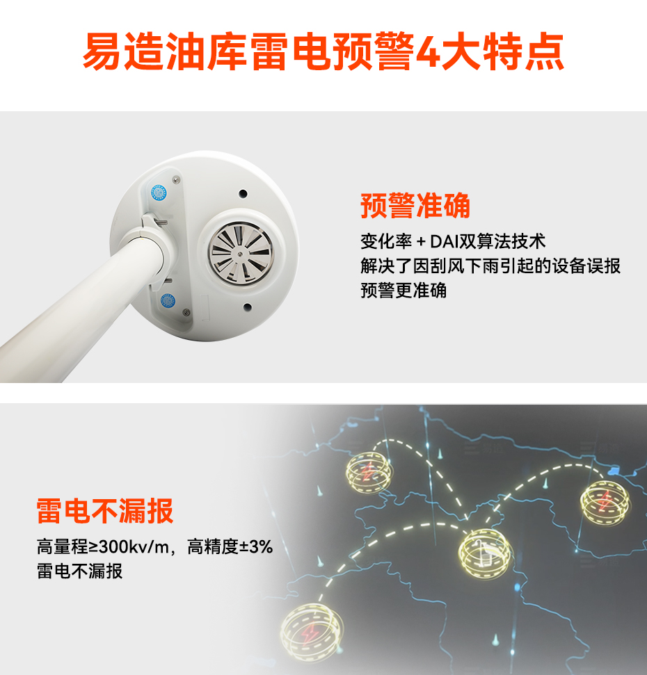 易造場(chǎng)磨式智能雷電預(yù)警系統(tǒng)技術(shù)成熟,可實(shí)時(shí)在線監(jiān)測(cè)罐區(qū)20公里內(nèi)的雷電活動(dòng),并提前30分鐘發(fā)出黃橙紅三級(jí)雷電警報(bào),及時(shí)通知用戶做好防雷應(yīng)急預(yù)案。其算法分析軟件集成在探頭內(nèi)部,無(wú)需網(wǎng)絡(luò)即可輸出信號(hào)至本地報(bào)警,數(shù)據(jù)安全可靠,IP65預(yù)警探頭具有WF2防腐等級(jí),可在各種環(huán)境條件下長(zhǎng)期穩(wěn)定運(yùn)行,使用壽命長(zhǎng)達(dá)10年以上。