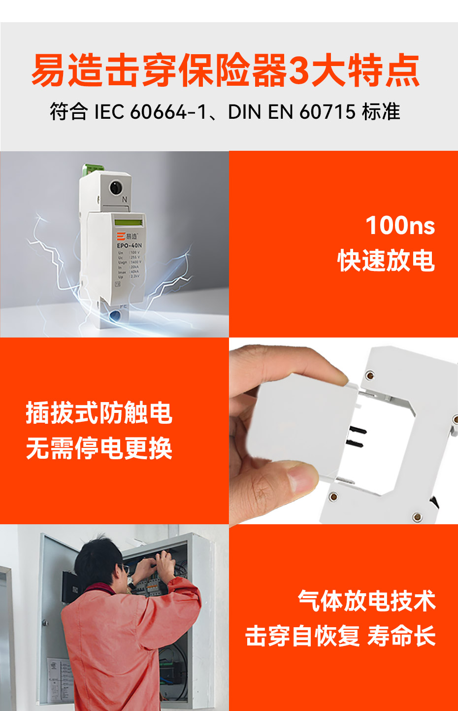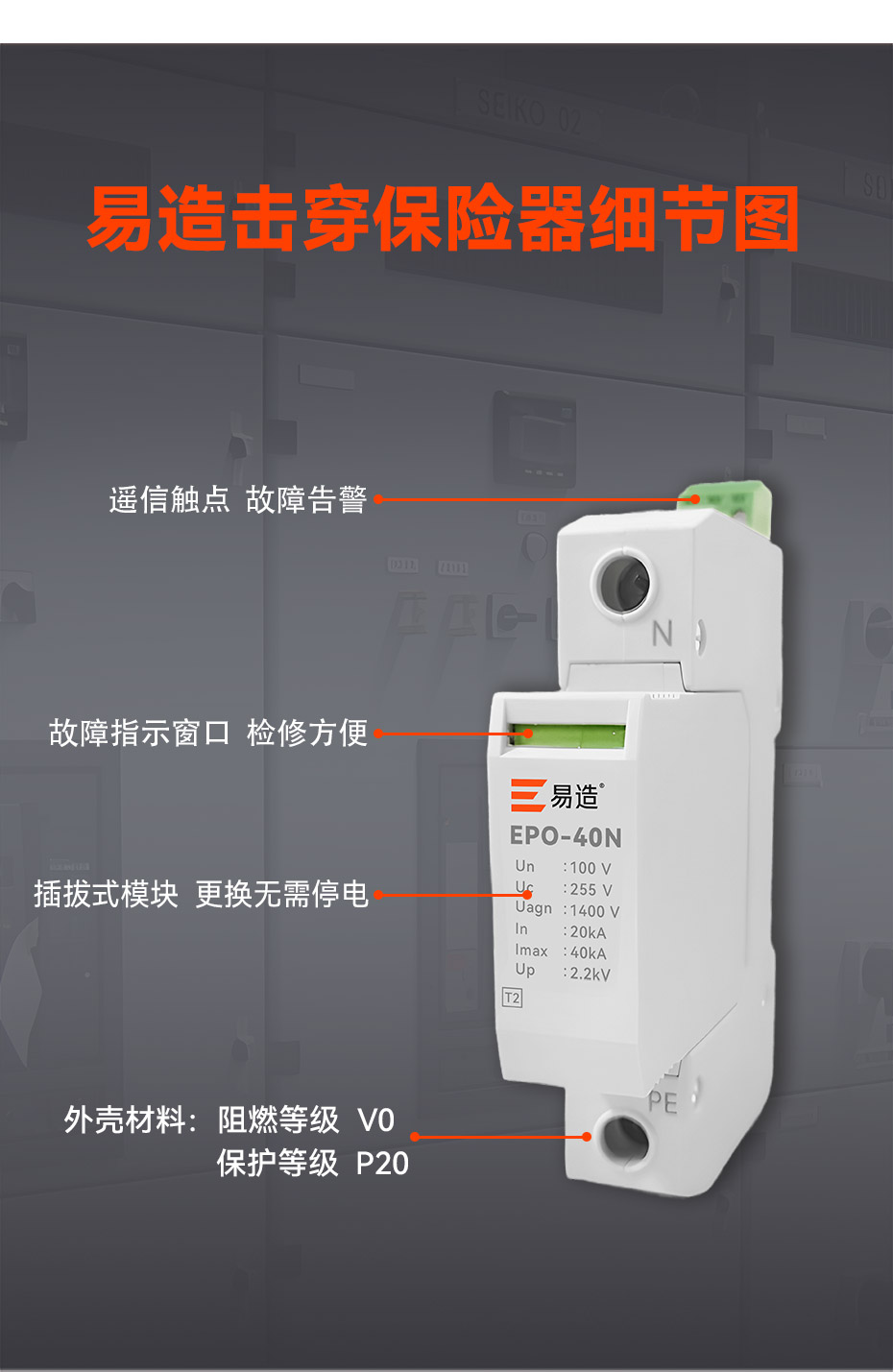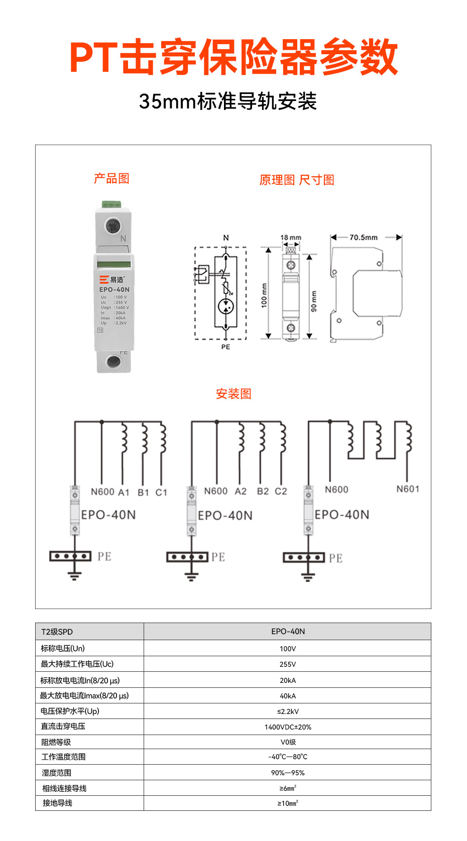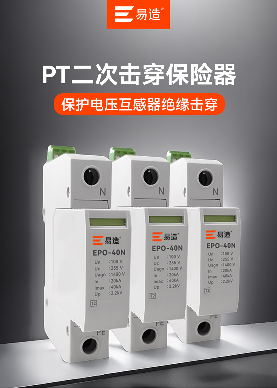 易造EPO-40N PT二次擊穿保險器應(yīng)用于電力變配電站的PT電壓互感器柜二次側(cè),當(dāng)過電壓出現(xiàn)時,擊穿保險會迅速導(dǎo)通,呈現(xiàn)低阻抗對地通路,保護PT柜內(nèi)電壓互感器和后端設(shè)備免受過電壓的侵害。
